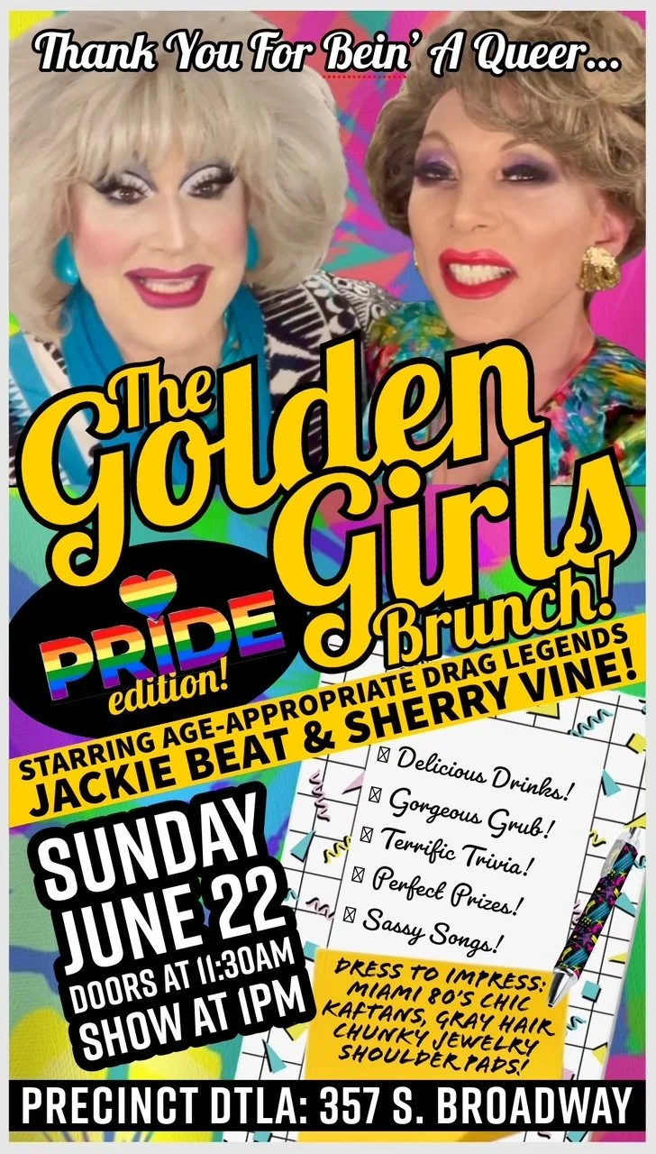 Jackie Beat (Dorothy) and Sherry Vine (Blanche) host and perform a hilarious brunch show that’s all Golden Girlz!! Live singing, duets, comedy, trivia with prizes and cheesecake! Precinct DTLA