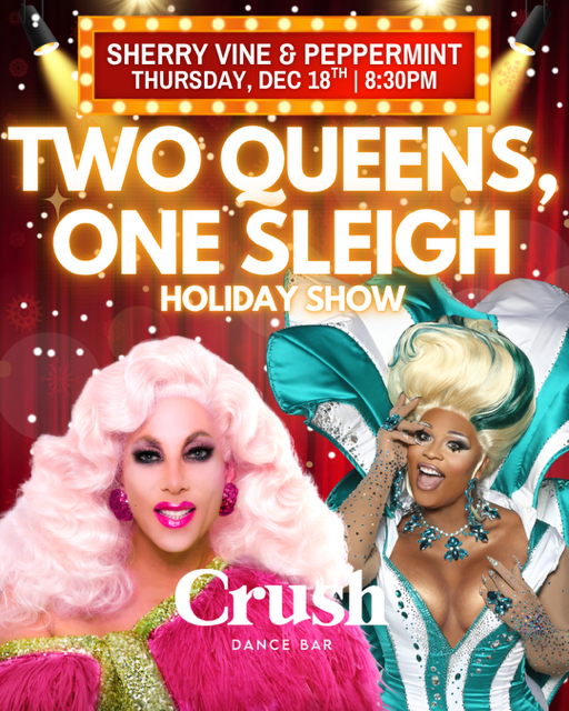 Drag Race superstar Peppermint and drag legend Sherry Vine join forces for one spectacular holiday show! Appearing onstage together for the first time in DC in 10 years!! Live singing, comedy, duets and loads of cheer. Crush Dance Bar, showtime 8:30pm